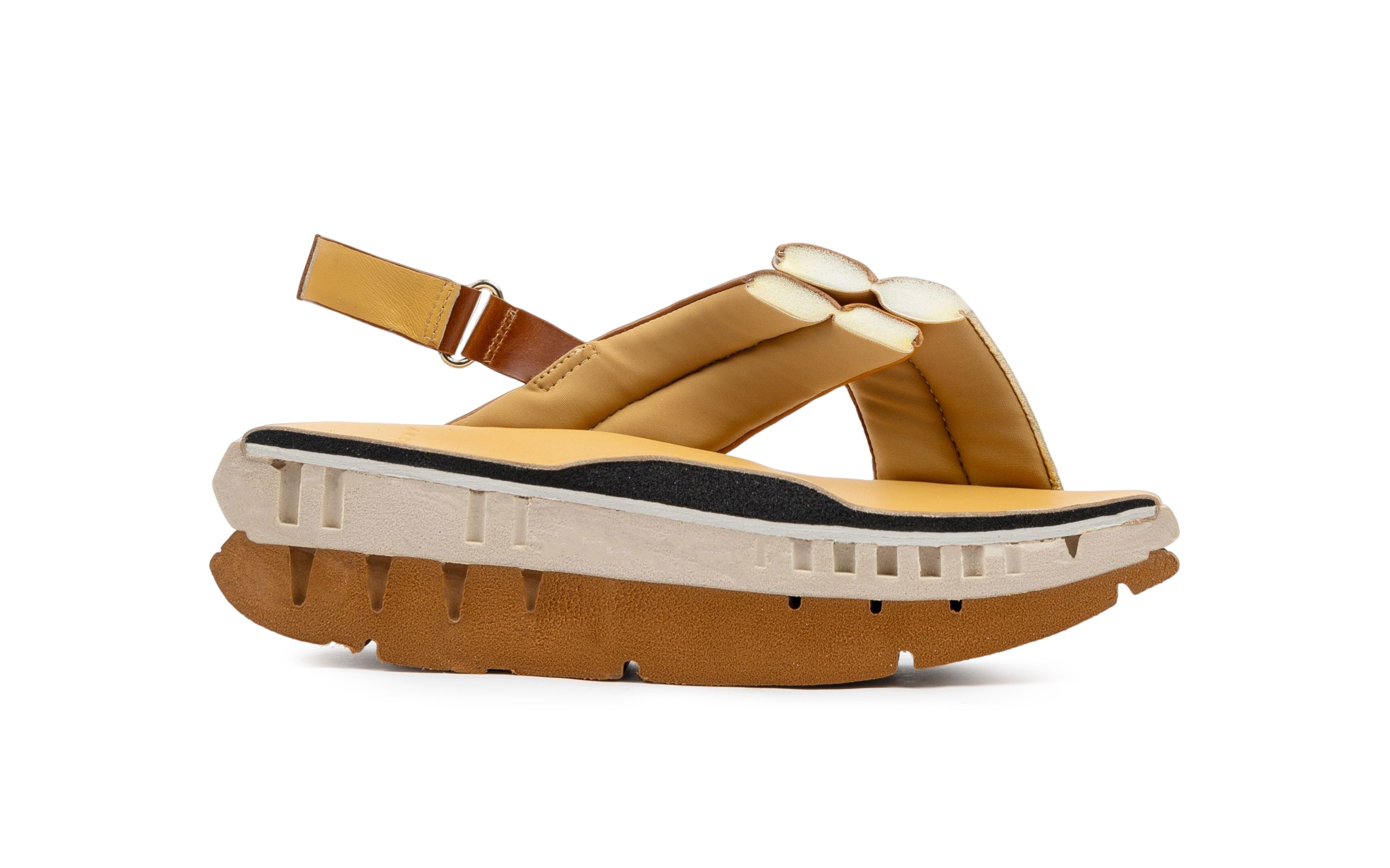 Sporting a structured ripple design, MELLOW alludes to the soft flowing forms of flower petals or whipped cream. Inspired by the twisting nature of the material, it also allows for added bounce and comfort. Divided into two parts, the softer outsole section absorbs shock on impact while the sturdy bottom section maintains support and durability throughout.