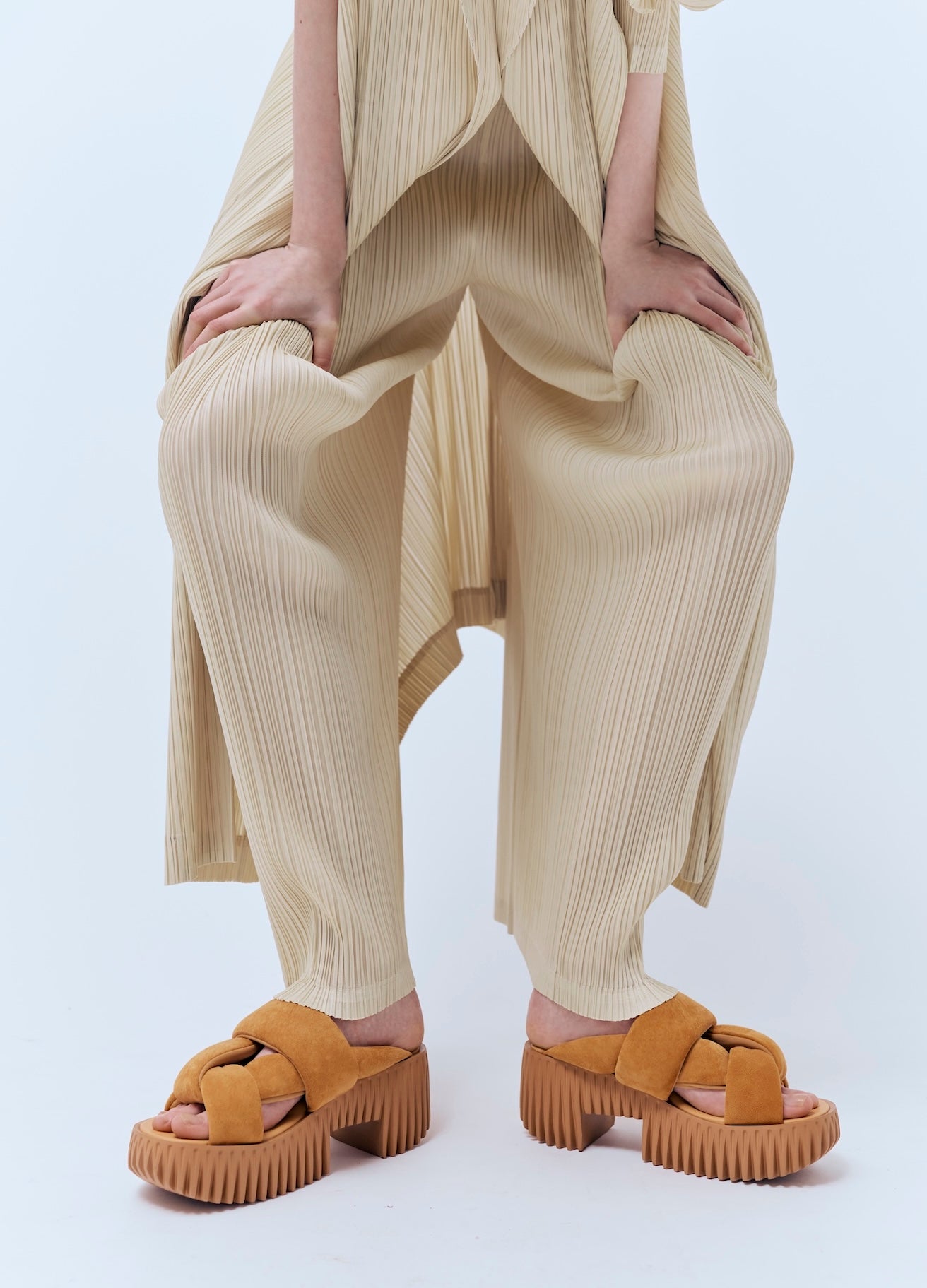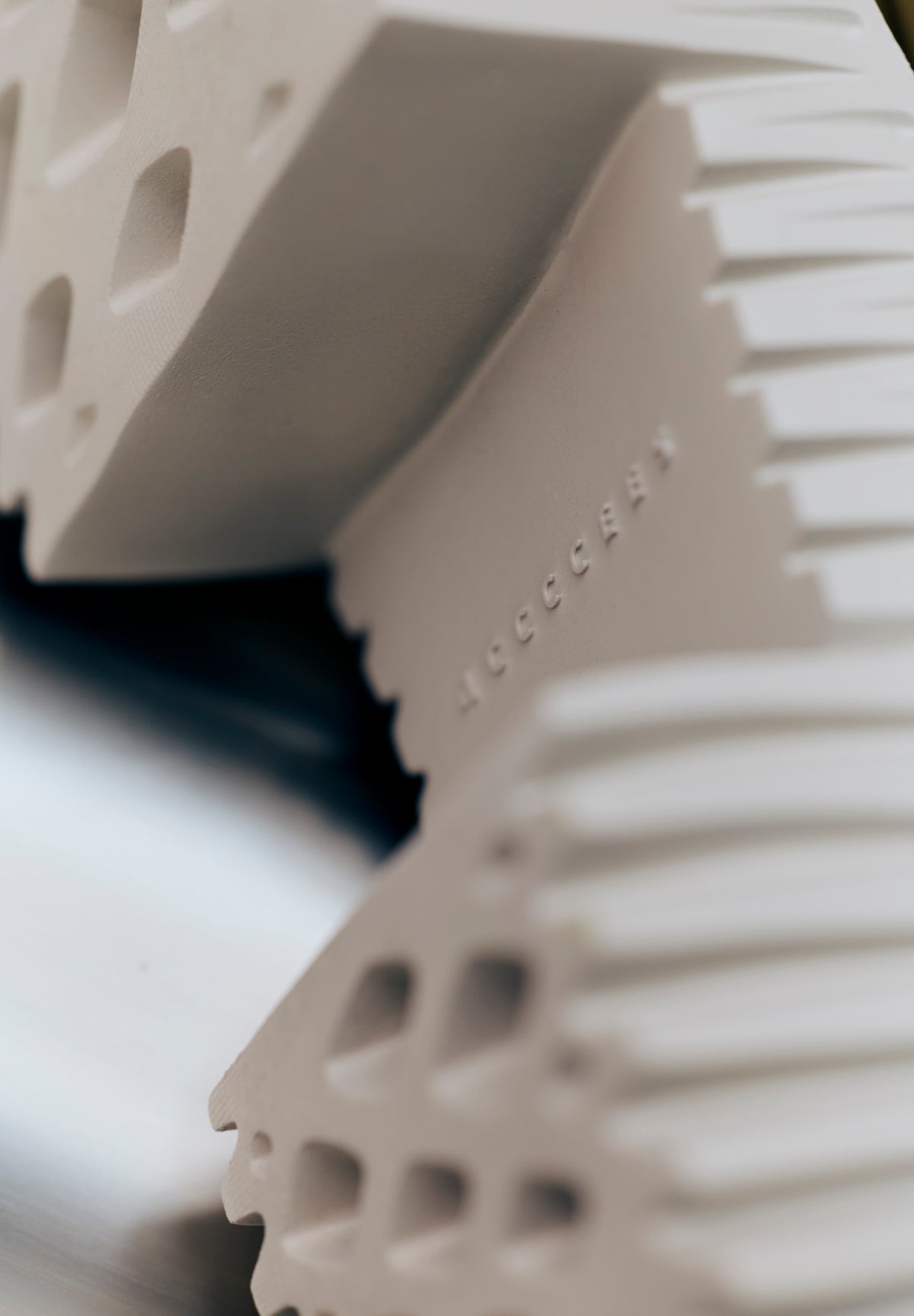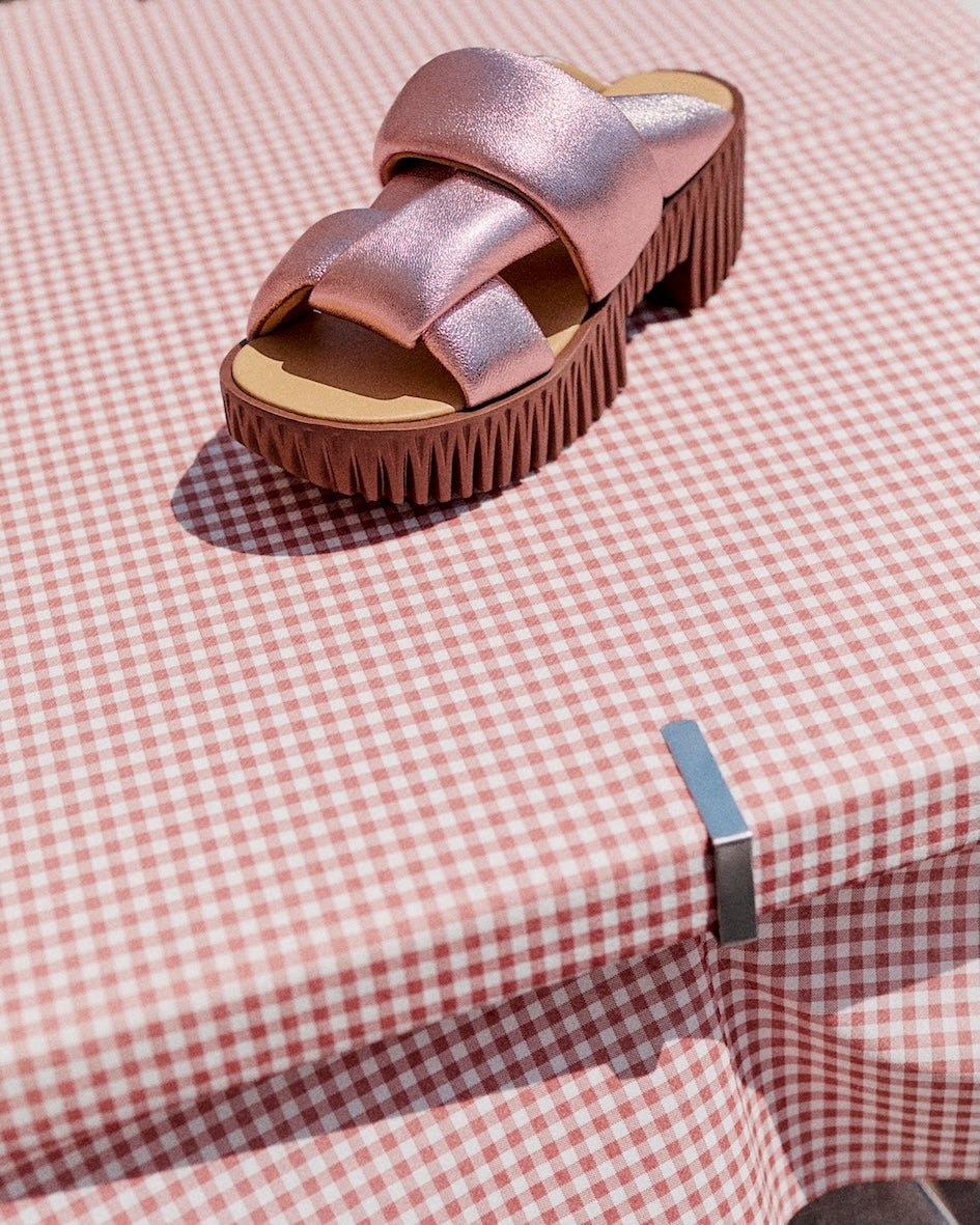 An avant-garde reimagining of traditional wooden clogs, PLIA exudes a fashion-forward appeal with carved out blocks to create a lightweight, yet voluminous platform base. The intricate ribbed texture of its base speaks to the organic characteristics of dandelion heads, mushroom gills and tree bark. Made from foam-rubber, this design is an exquisite, modern interpretation of a classic silhouette.