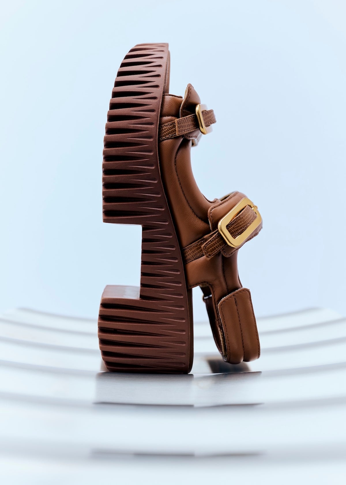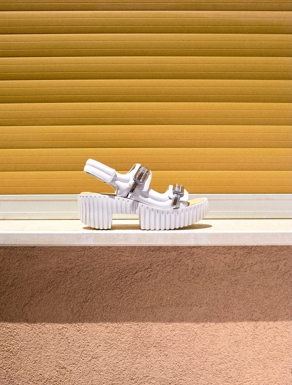 An avant-garde reimagining of traditional wooden clogs, PLIA exudes a fashion-forward appeal with carved out blocks to create a lightweight, yet voluminous platform base. The intricate ribbed texture of its base speaks to the organic characteristics of dandelion heads, mushroom gills and tree bark. Made from foam-rubber, this design is an exquisite, modern interpretation of a classic silhouette.
