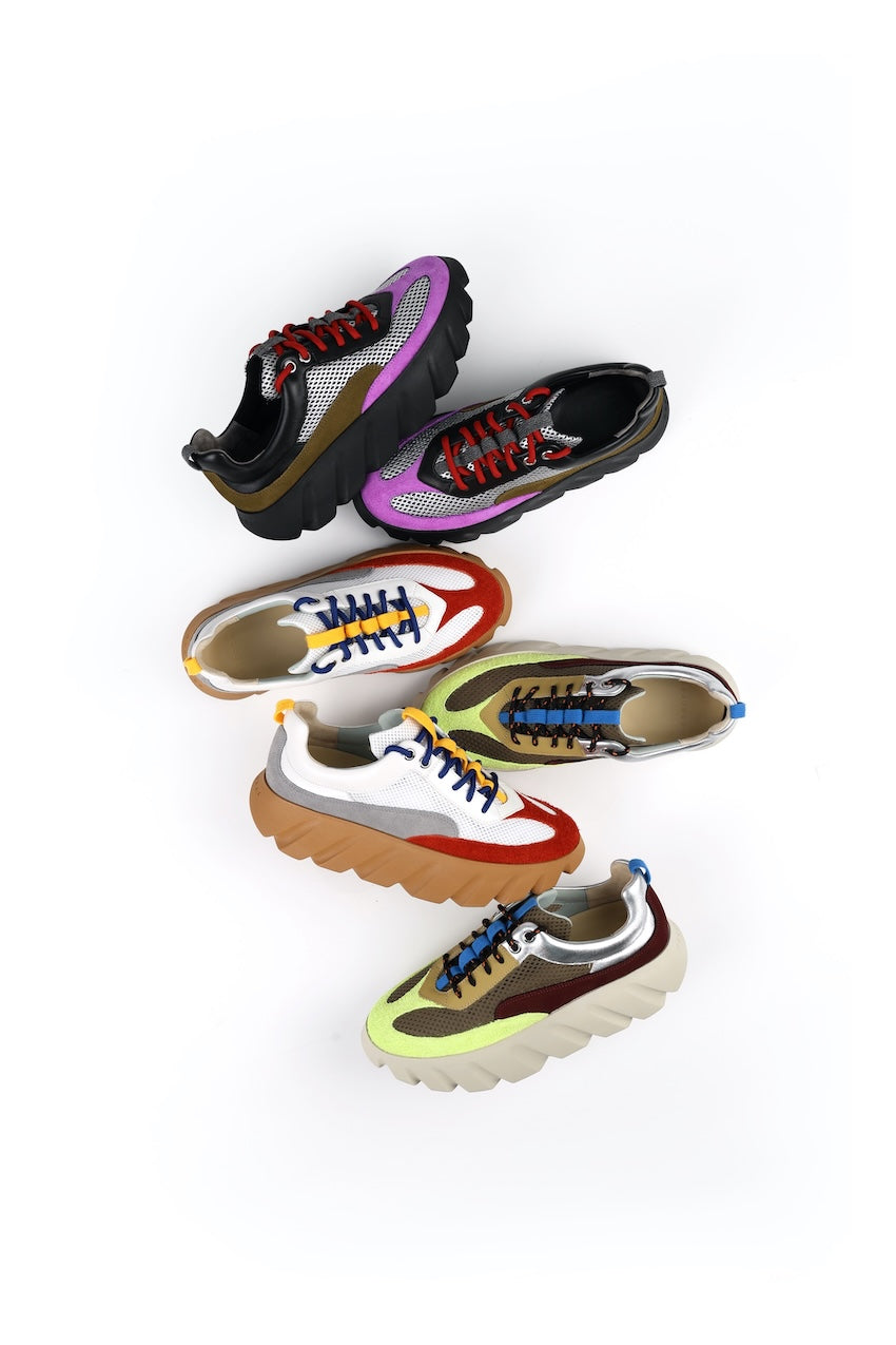 Merging a lightweight structure and a vibrant expression of movement, FLOW is made from panels of coated mesh and a combination of leathers. Lined with lycra for added comfort, the design is completed with a padded collar, securing the foot in place. Four colours available.