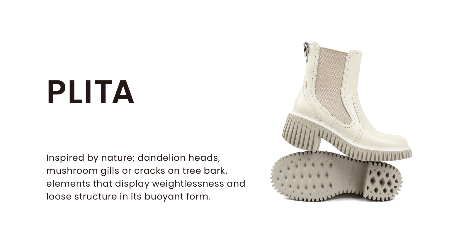 Taking its cue from a heavy lug sole and exaggerated proportions, PLITA’s buoyant form alludes to natural elements such as dandelion heads, mushroom gills, or the cracks of tree bark where loose structural components come together as one. Its foamed rubber outsole is lightweight, flexible, and voluminous (a 60mm heel with a 20mm platform), culminating in a modern, fresh, and comfortable appeal.